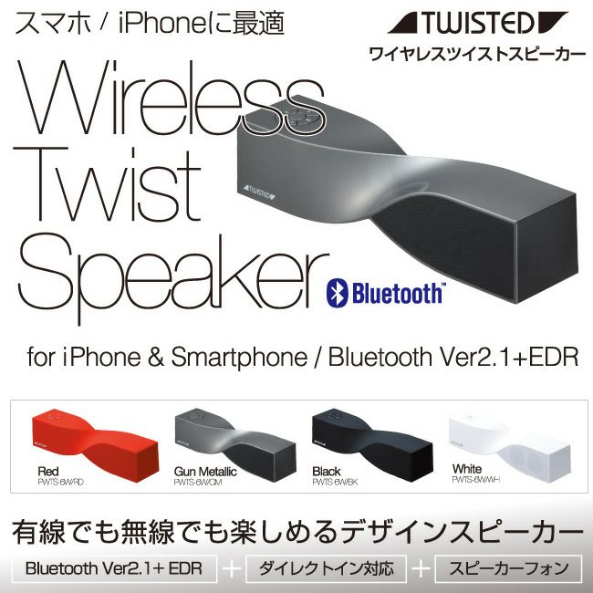 ■特徴のあるツイストデザインスピーカー + 驚きのクリアサウンド ■スマートフォンやiPhoneで気軽によいサウンドを楽しめる無線(Bluetooth)接続と 有線ダイレクトイン(3.5mmステレオプラグ)接続に対応。 ■Bluetooth(ブルートゥース)接続時はハンズフリーのスピーカーフォン機能も使用できます。 ■余裕の3W+3Wの高出力。 ■4cmフルレンジステレオスピーカーに6cm変形パッシブウーハーを搭載し、小型サイズからは想像出来ない豊かなサウンドが楽しめます。 ■電源がない場所でも使用できるリチウムイオンバッテリ搭載。