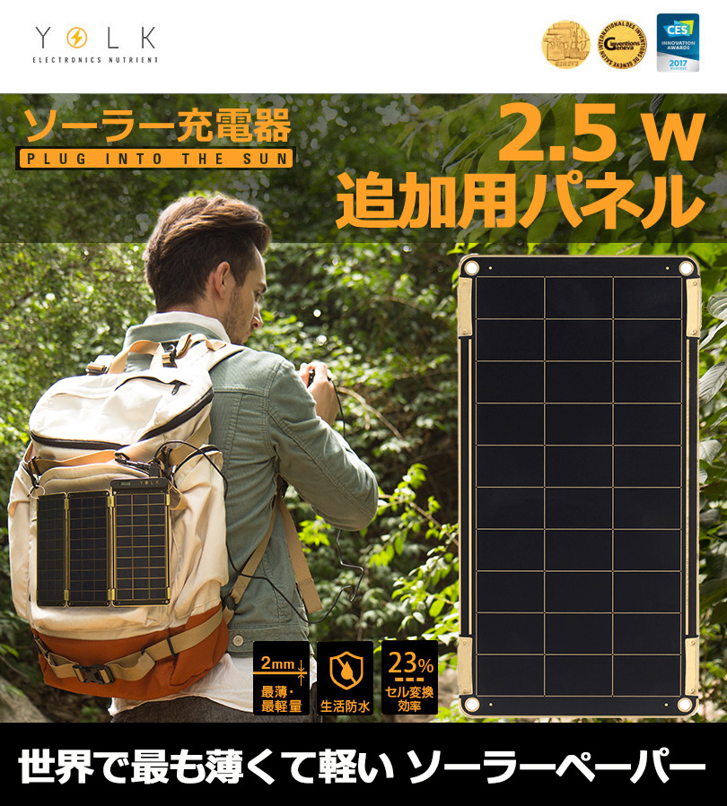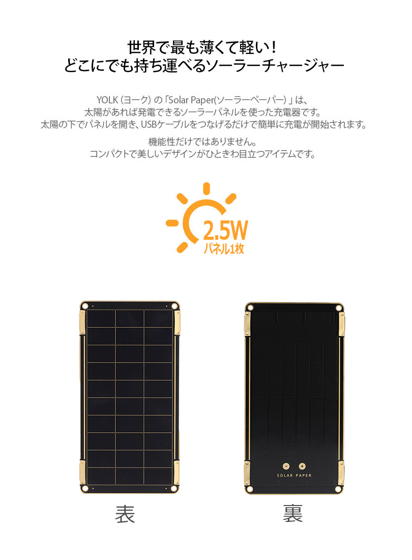 『YOLK ソーラー充電器 【追加用パネル1枚】 Solar Paper 2.5W』 軽量 スマホ 充電器