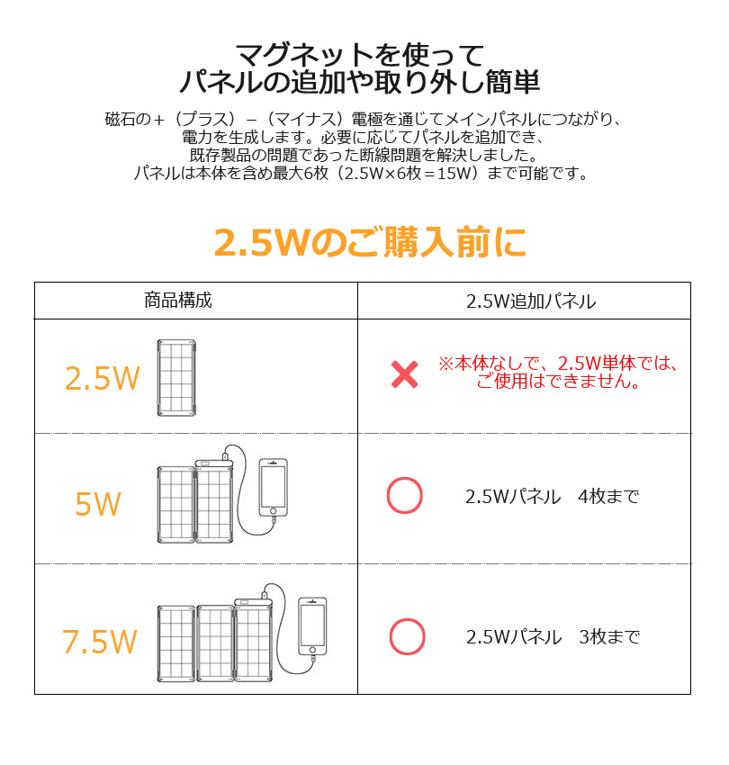 磁石の+(プラス)-(マイナス)電極を通じてメインパネルにつながり、電力を生成します。必要に応じてパネルを追加でき、既存製品の問題であった断線問題を解決しました。パネルは本体を含め最大6枚(2.5W×6枚=15W)まで可能です。