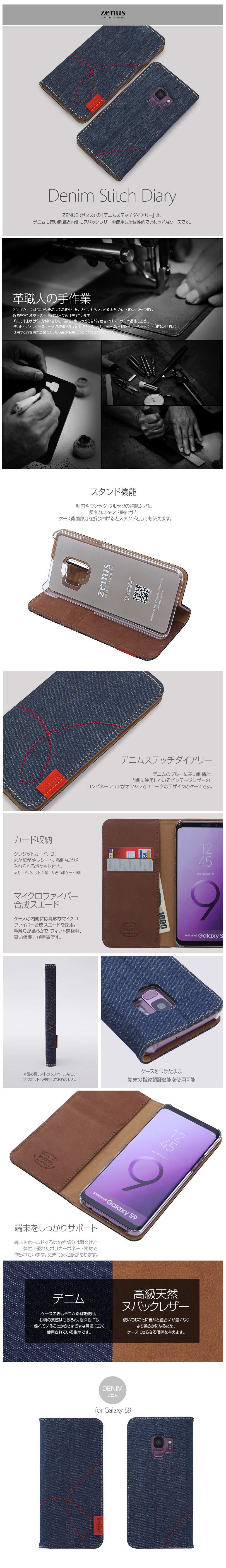 『ZENUS Denim Stitch Diary 』 Galaxy S9 ケース 手帳型 デニム 本革 レザー