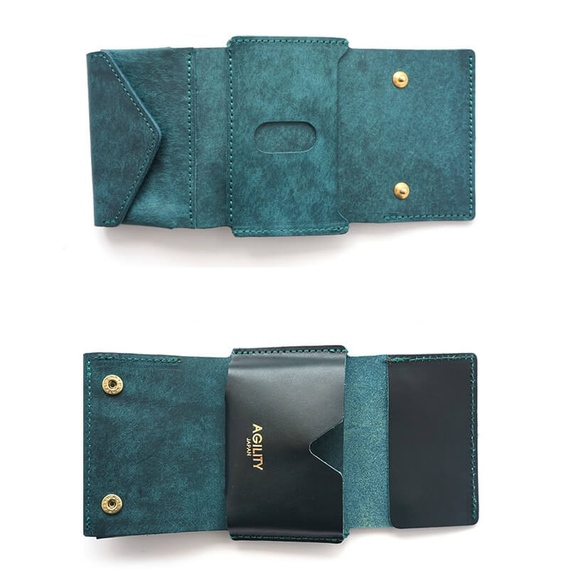 センターに位置したカードポケットを中心にお札を三つ折りに包み込むよう収納します。無駄な機能を一切省き、小型化しています。