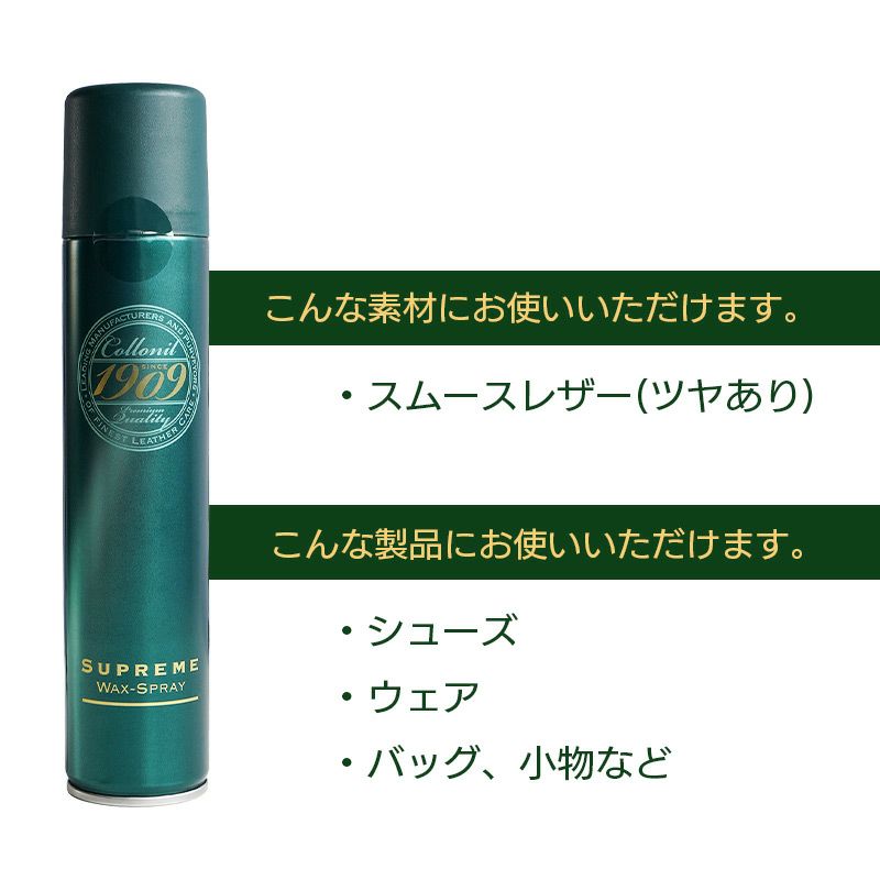 | 備考 | 鹿革、ヌメ革は新しい状態や乾燥が進んだ状態の場合、大量にクリームを吸い込んでしまうためシミができる可能性があります。この場合は1909プロテクトスプレーを使用してベースを作った後にクリームを塗布することをおすすめします。ある程度エイジングの進んだ状態であればシミの恐れもなく非常に相性の良いクリームです。 | 象革、カバ革はヌバックのような起毛皮革に近い特性であり、プロテクトスプレーで全体に均一に栄養成分を与えるのをおすすめします。鹿革、ヌメ革などのデリケートな素材にも安心してお使いいただけます。 | ブライドルレザーやコードバンなど光沢を生かした素材に適したスプレーです。一般のフッ素系防水スプレーを塗布すると素材に曇りが出る可能性がありますが、こちらは綺麗な光沢を維持しながら栄養と防水効果を与えられます。 | 揮発性が高くデリケートな素材にもダメージを与えにくいクリーナーです。使用した後に各素材が乾燥気味になるためクリームDXやプロテクトスプレーで栄養補給をしてください。栃木レザーなどベジタン系のものはクロスに色が付着しますが、ベースの色を抜くほどの強力なクリーナーではありません。 | アルコールが入っていないため皮革素材に対してシミやダメージを発生させにくいクリーナーですが、水分が含まれているため鹿革や乾燥したヌメなどにはおすすめできません。 |