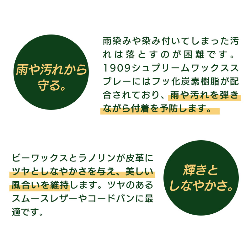 雨染みや染み付いてしまった汚れは落とすのが困難です。1909シュプリームワックススプレーにはフッ化炭素樹脂が配合されており、雨や汚れを弾きながら付着を予防します。