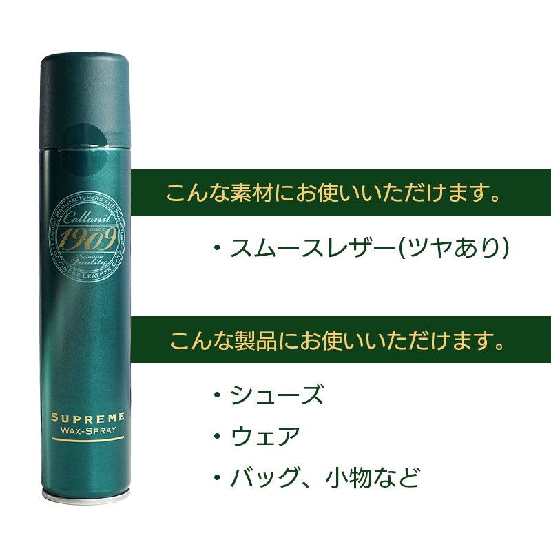 フッ化炭素樹脂、ビーワックス、ラノリンを加えたブレンドオイルを含む防水スプレーです。フッ化炭素樹脂が皮革繊維に深く浸透して防水効果を与えると同時に、ビーワックスとラノリンが皮革にツヤとしなやかさを与え、美しい風合いを維持します。ツヤのあるスムースレザーやコードバンに最適です。