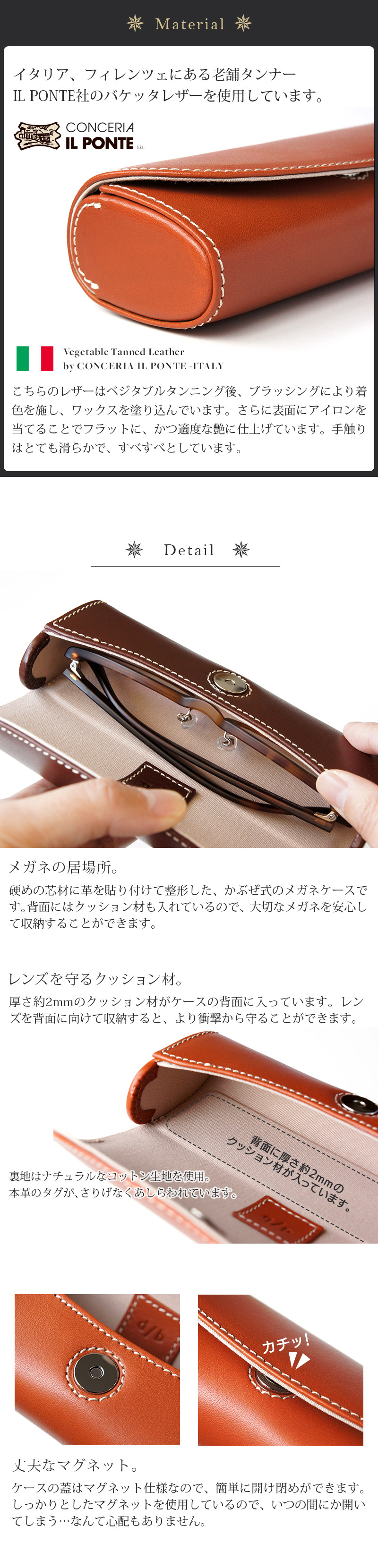 ナチュラルな光沢と、滑らかな手触りが特徴のイタリアンベジタブルタンニングレザーを使ったメガネケースです。フィレンツェのタンナー、IL PONTE社でなめされたこのレザーは、発色が美しく、また適度なツヤがあり、使い込むうちにあなただけのケースへと馴染んでいきます。