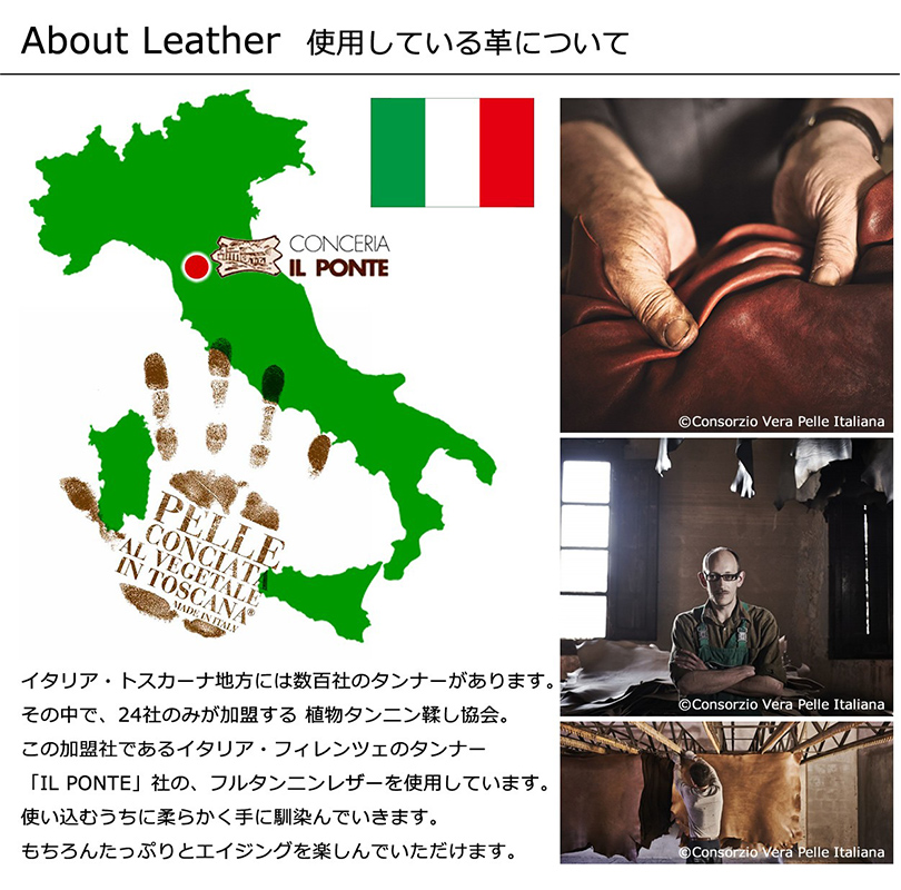 ■ イタリアフィレンツェのタンナー、IL PONTE 社のフルタンニンレザー使用。使い込むうちに柔らかく手に馴染んでいきます。もちろんたっぷりとエイジングを楽しんでいただけます。ベジタブルタンニング後、ブラッシングにより着色し、ワックスを塗り込み、さらにアイロンを当てて表面をフラットに、かつ適度な艶に仕上げています。