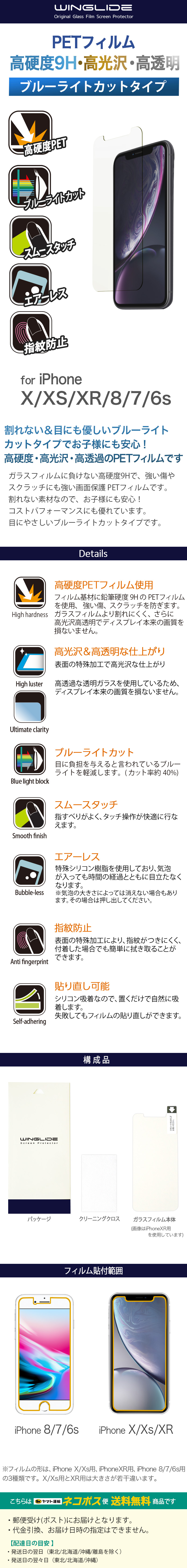 商品特長 ■ iPhoneX / XS / XR / SE / 8 / 7 / 6s 専用の ブルーライトカット 高硬度PETフィルム です。