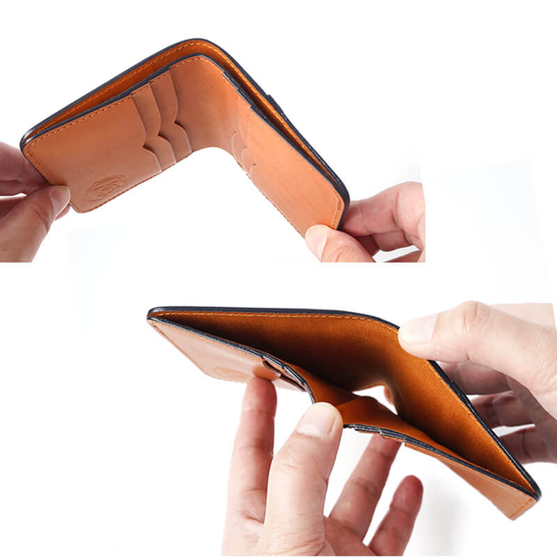 札入れとカード入れだけのスリムでスマートな二つ折り財布です。 高級レザー製品として愛用される英国トーマスウェア&サンズ社のブライドルレザーを使用しています。