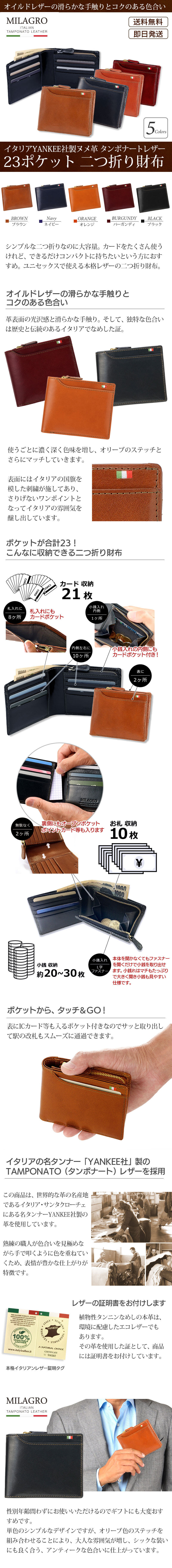 【イタリアンレザー TAMPONATO】二つ折り財布 小銭入れあり 23ポケット 本革 MILAGRO