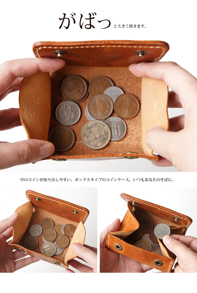 中のコインが取り出しやすい、ボックスタイプのコインケース。いつもあなたのそばに。