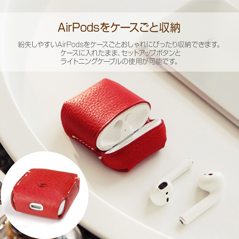紛失しやすいAirPodsをケースごとおしゃれにぴったり収納できます。ケースに入れたまま、セットアップボタンとライトニングケーブルの使用が可能です。