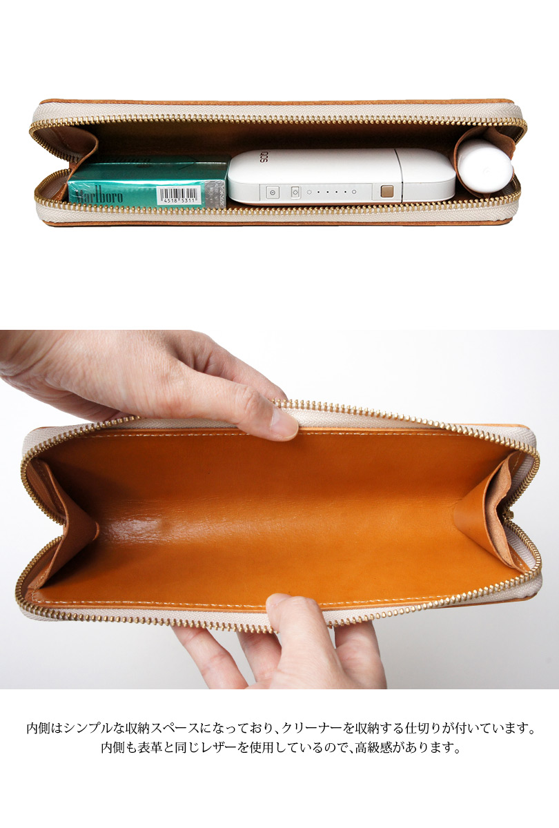 ■無駄の無いスッキリとしたデザインのラウンドジップタイプのiQOSケース。内張りとの間に芯材を入れ、型崩れを防ぐ仕様になっています。