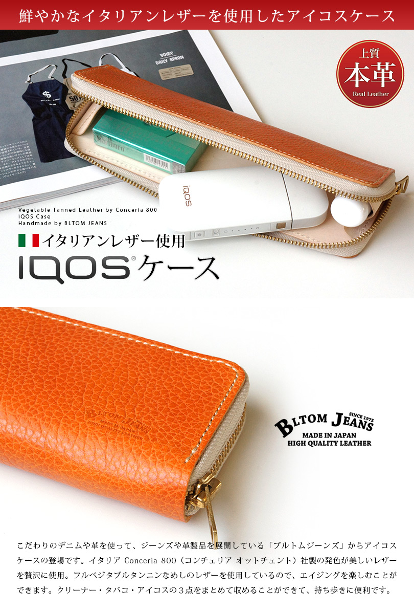 ■こだわりのデニムや革を使って、ジーンズや革製品を展開している「ブルトムジーンズ」からアイコスケースの登場です。イタリア Conceria 800(コンチェリア オットチェント)社製の発色が美しいレザーを贅沢に使用。フルベジタブルタンニンなめしのレザーを使用しているので、エイジングを楽しむことができます。