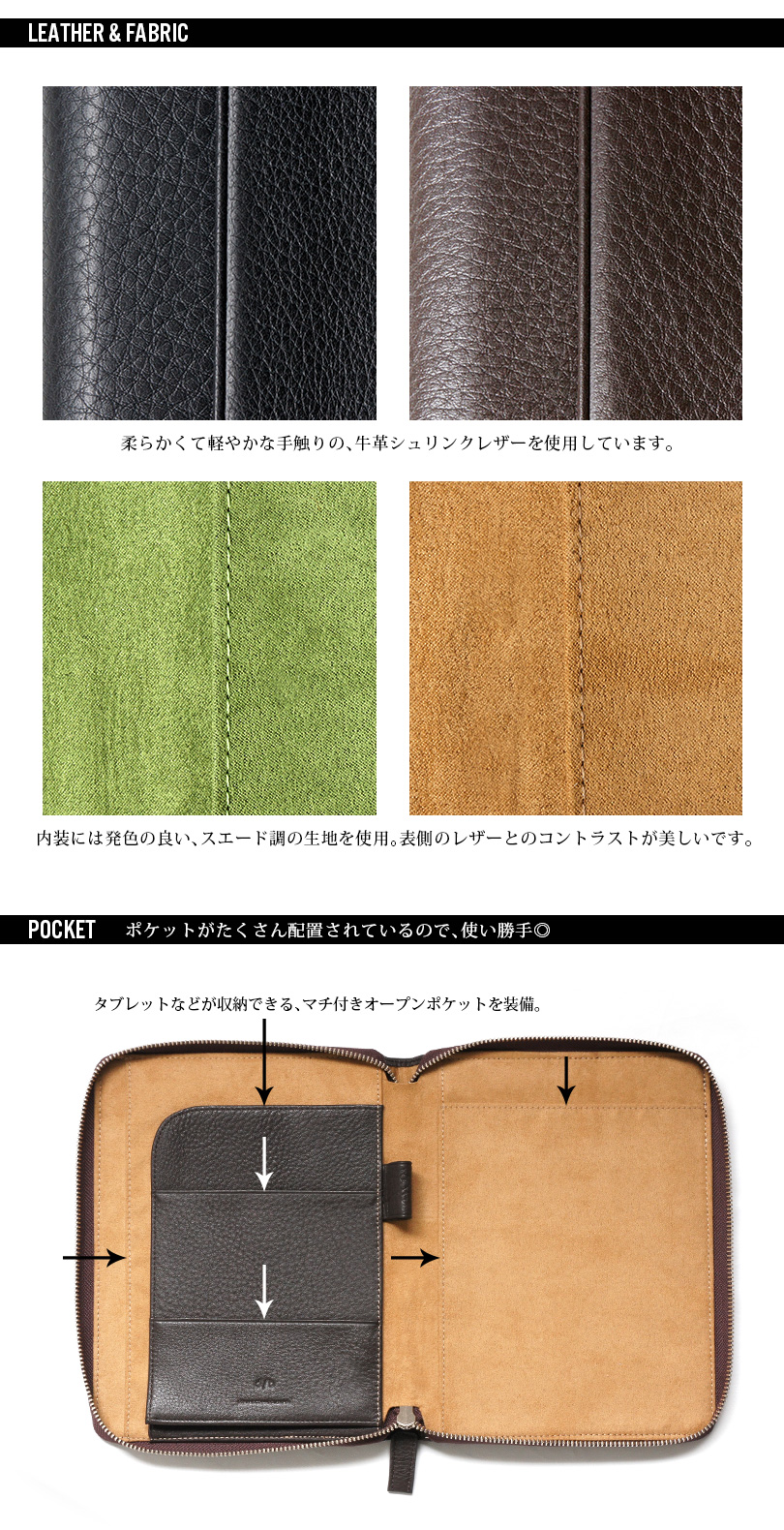■ムース革(鹿革)のように肉厚がありながら、とても柔らかな風合いと軽さを兼ね備えた、牛革を使ったノートパッドホルダーです。iPad miniやA5サイズのノート、ペン、電卓など、身の回りの小物をスマートに、かつスタイリッシュに持ち運ぶことができます。このノートパッドに使われている牛革は型押しではなく、天然のシュリンク(ちぢみ皺)なので、裁断する部位によってそれぞれ表情が違うのが特徴です。その手触りは、ずばりSOFT & LIGHT。一度手にすると、その柔らかさに驚くこと間違いありません。滑らかな手触りと発色の良いスエード調のポリエステル生地を内装に配色して、おしゃれに仕上げました。