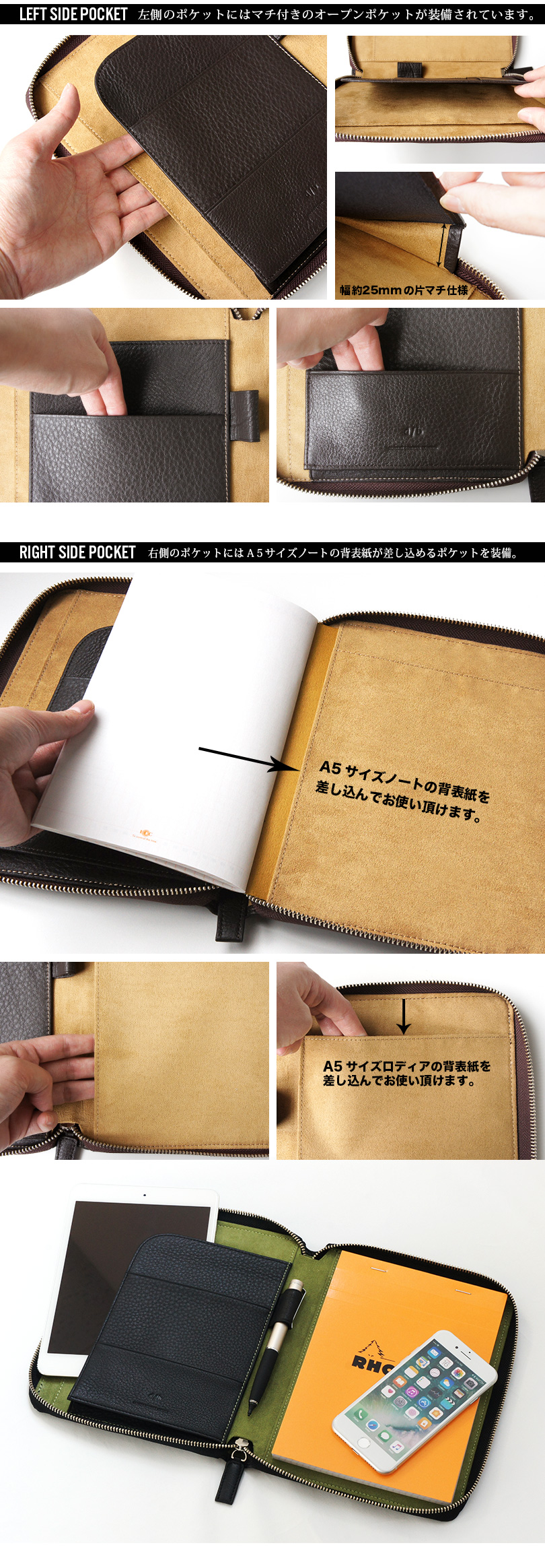 ■右側のポケットにはA5サイズノートの背表紙が差し込めるタイプのポケットと、A5サイズロディアの背表紙を差し込んでお使い頂けるポケットが装備されています。