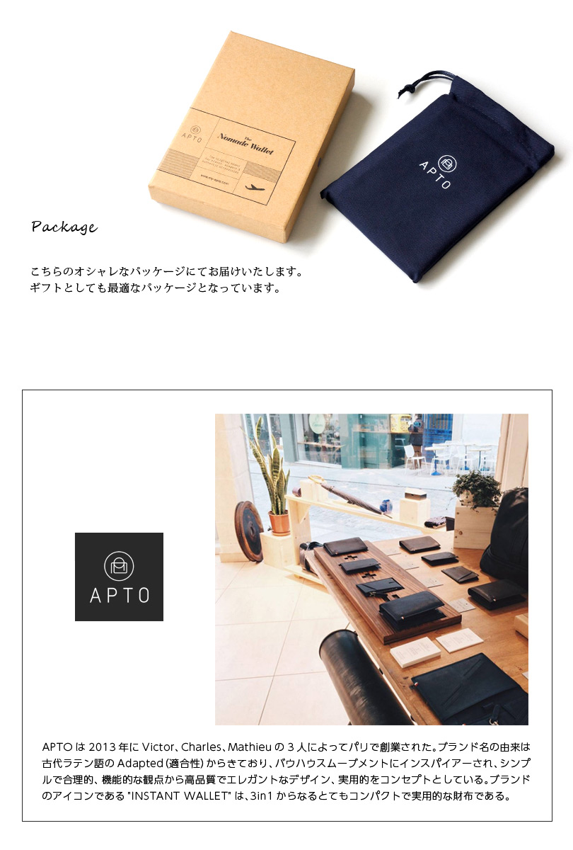 APTOは2013年にVictor、Charles、Mathieuの3人によってパリで創業された。ブランド名の由来は古代ラテン語のAdapted(適合性)からきており、バウハウスムーブメントにインスパイアーされ、シンプルで合理的、機能的な観点から高品質でエレガントなデザイン、実用的をコンセプトとしている。ブランドのアイコンである"INSTANT WALLET"は、3in1からなるとてもコンパクトで実用的な財布である。