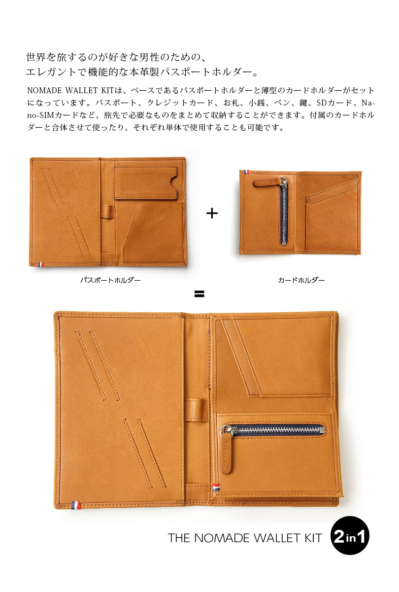NOMADE WALLET KITは、ベースであるパスポートホルダーと薄型のカードホルダーがセットになっています。パスポート、クレジットカード、お札、小銭、ペン、鍵、SDカード、Nano-SIMカードなど、旅先で必要なものをまとめて収納することができます。付属のカードホルダーと合体させて使ったり、それぞれ単体で使用することも可能です。