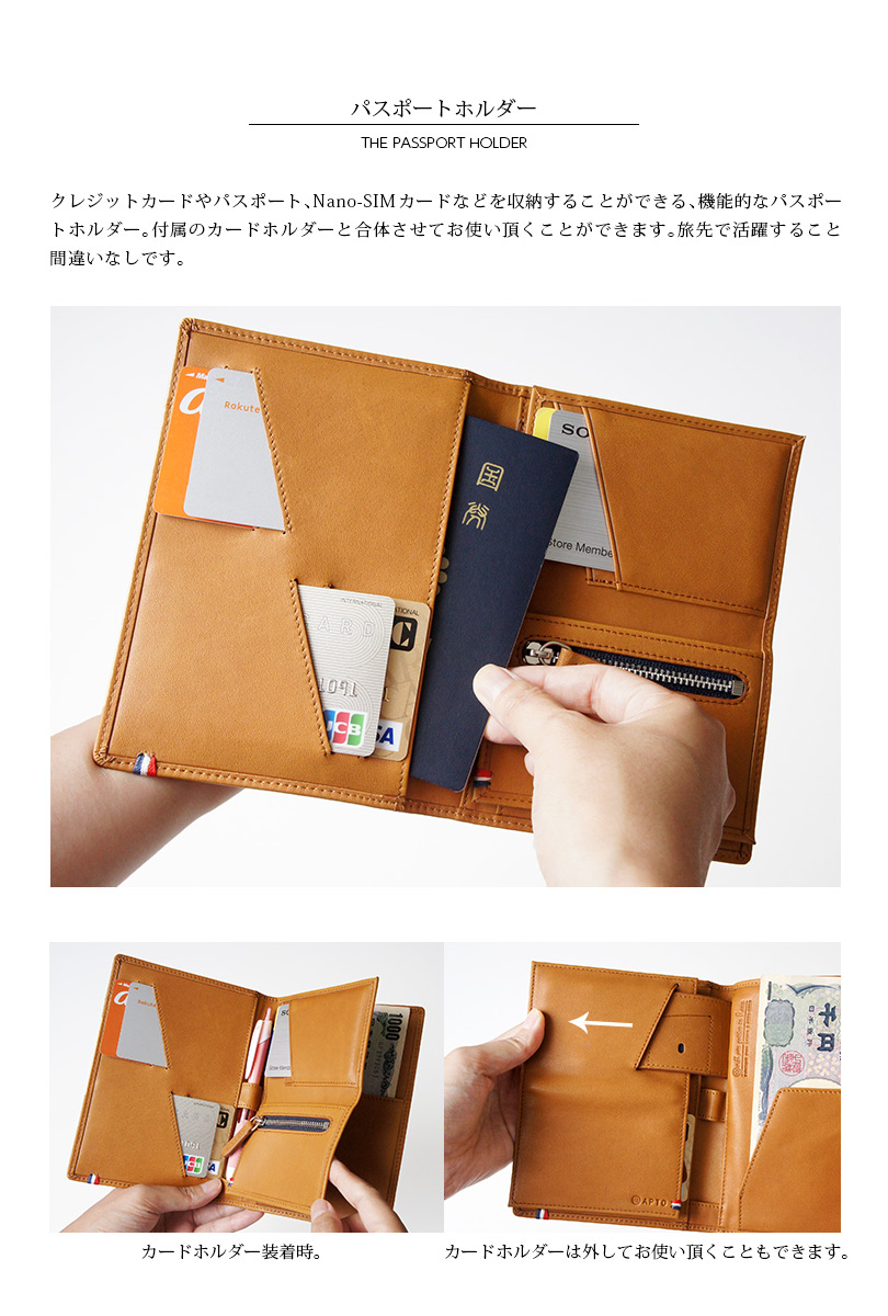 クレジットカードやパスポート、Nano-SIMカードなどを収納することができる、機能的なパスポートホルダー。付属のカードホルダーと合体させてお使い頂くことができます。旅先で活躍すること間違いなしです。