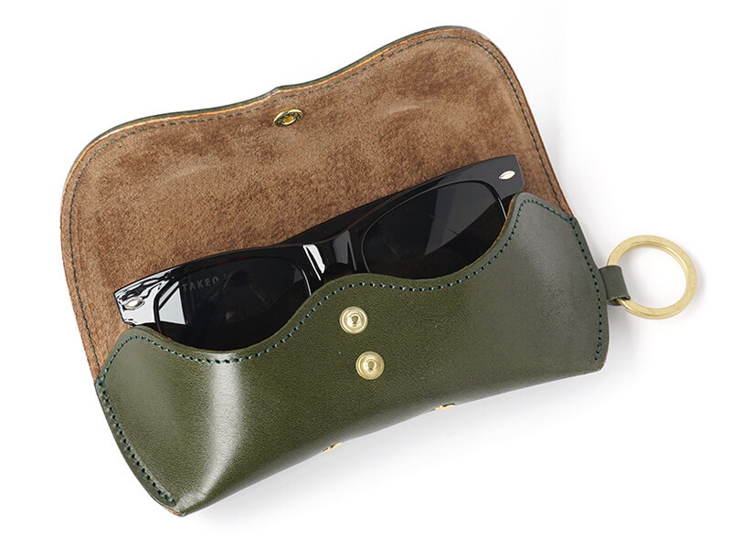 レンズが傷つかないよう内側にピッグスウェードを使用しており、大切なメガネを優しく包みます。蓋はダブルホックになっており、メガネのサイズに合わせてお好きな位置でとめられます。