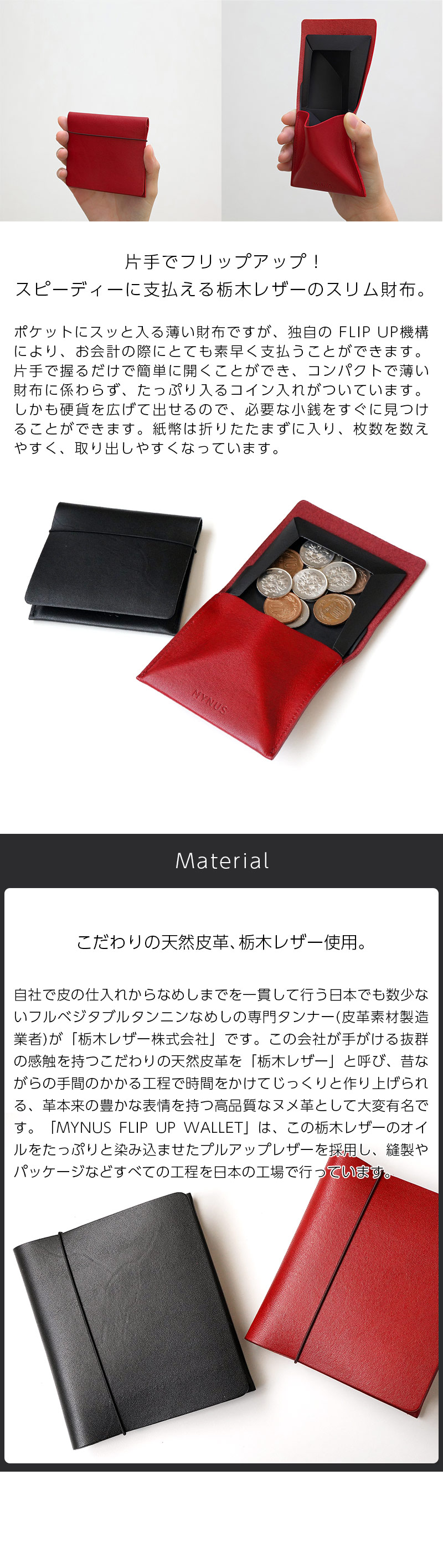 ■片手でフリップアップ!スピーディーに支払える栃木レザーのスリム財布。
