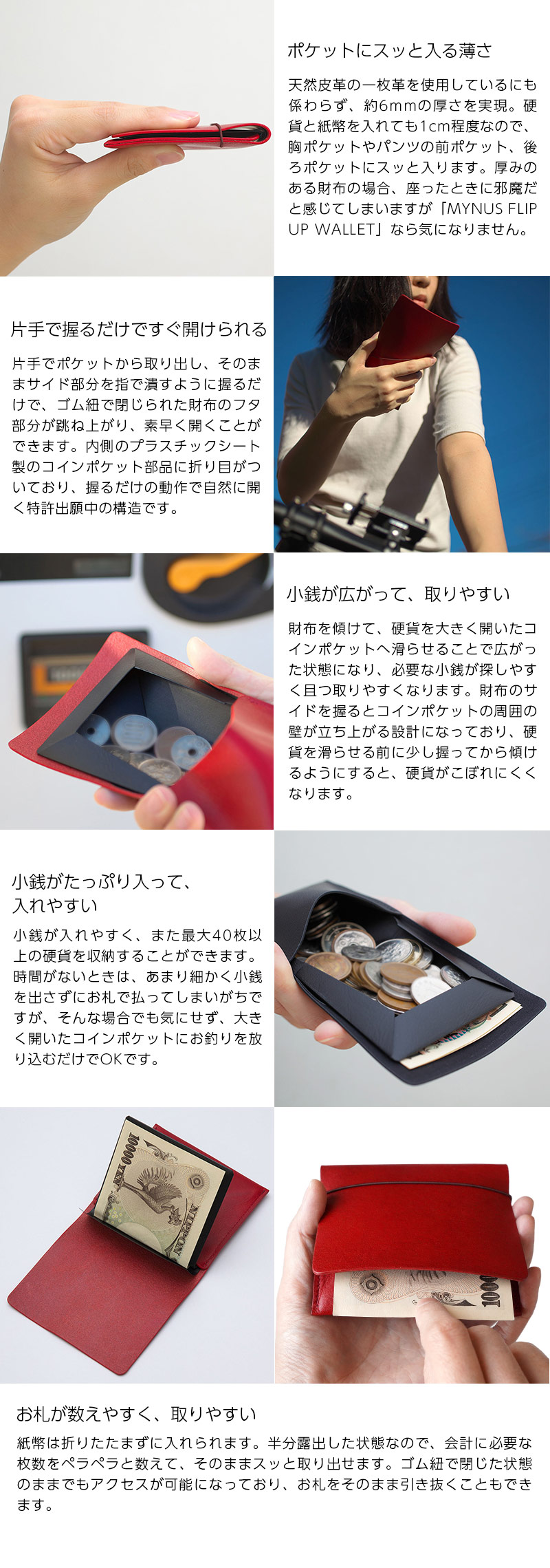 ■ポケットにスッと入る薄い財布ですが、独自のFLIP UP機構 ( 特許出願中 出願番号:特願 2018-159966) により、お会計の際にとても素早く支払うことができます。 片手で握るだけで簡単に開くことができ、コンパクトで薄い財布に係わらず、たっぷり入るコイン入れがついています。しかも硬貨を広げて出せるので、必要な小銭をすぐに見つけることができます。紙幣は折りたたまずに入り、枚数を数えやすく、取り出しやすくなっています。伝統的な植物タンニンなめしで製造された栃木レザーを、一枚革によるシンプルで美しいデザイン に仕上げ、使うほどに革の良さや色合いが生まれる天然皮革ならではの経年変化を楽しむことがで きます。