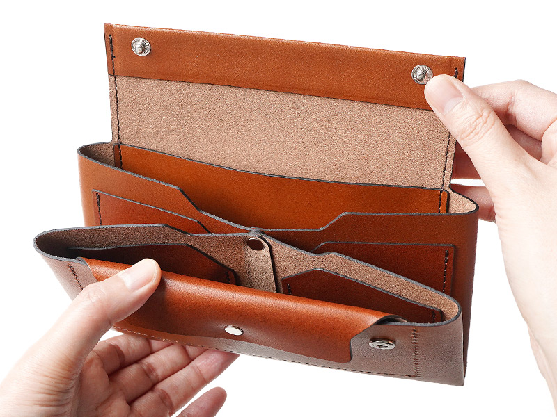 手前側のフタ付きポケットが小銭入れになっています。厚みを抑えるためにマチが省略されているので一見視認性が悪そうに感じられますが、ポケットの底を浅くしたことで中が見やすく、小銭が取り出しやすい構造になっています。
