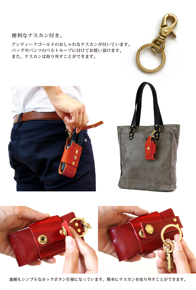 アンティークゴールドのおしゃれなナスカンが付いています。バッグやパンツのベルトループに付けてお使い頂けます。また、ナスカンは取り外すことができます。