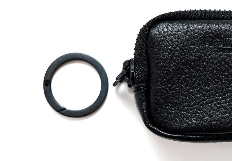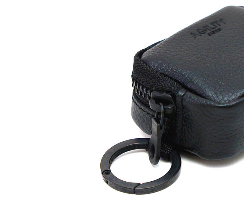 撥水材を染み込ませたシュリンクレザーを使用したミニポーチ。 リングカラビナでバッグの持ち手やベルトのDカンなどにぶら下げることができます。