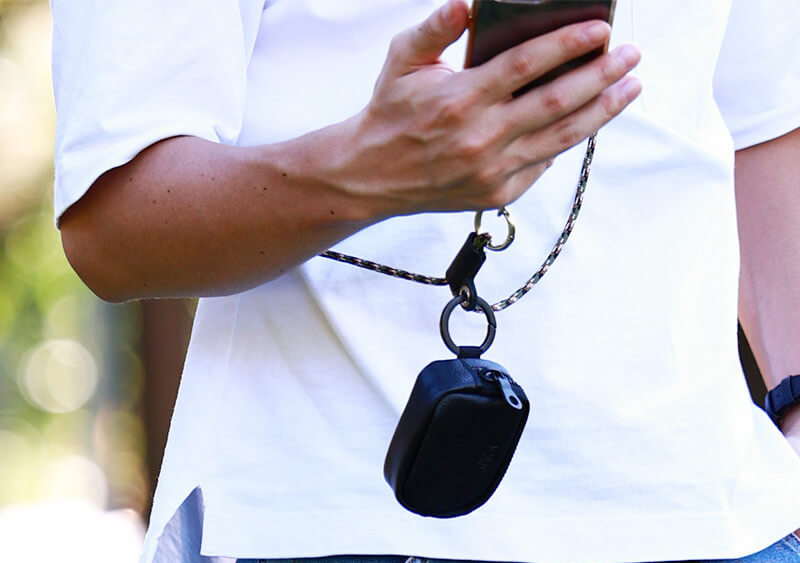 バッグの持ち手やベルトのDカンなどにぶら下げておけるので、すぐに出し入れができます。 お手持ちのスマホショルダーにぶら下げれば、スマホとセットで持ち歩きができます。