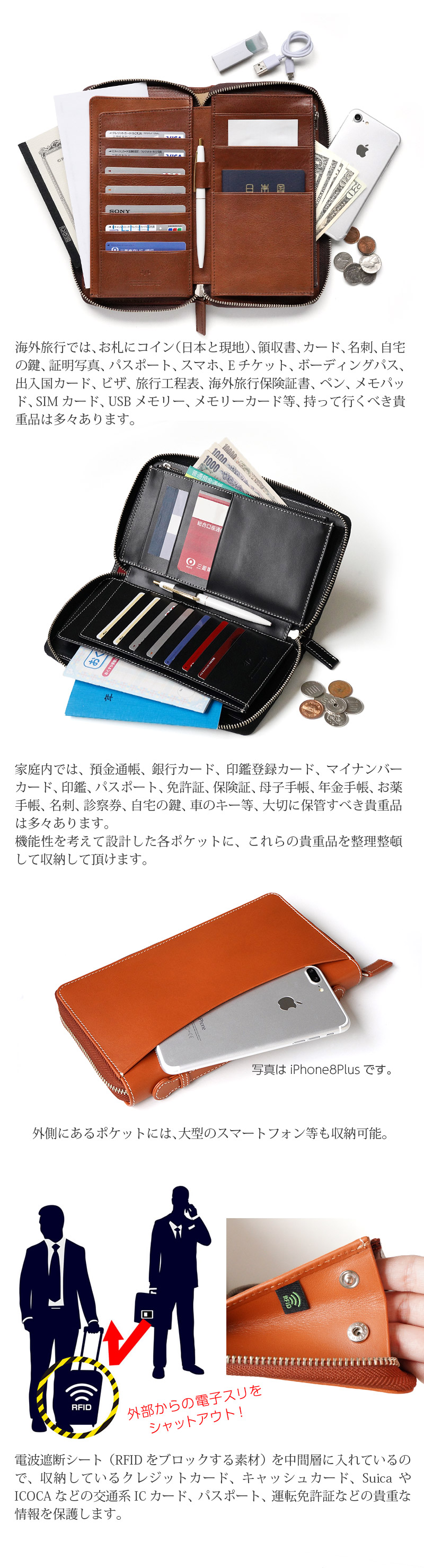 ■電波遮断シート(RFIDをブロックする素材)を中間層に入れているので、収納しているクレジットカード、キャッシュカード、SuicaやICOCAなどの交通系ICカード、パスポート、運転免許証などの貴重な情報を保護します。