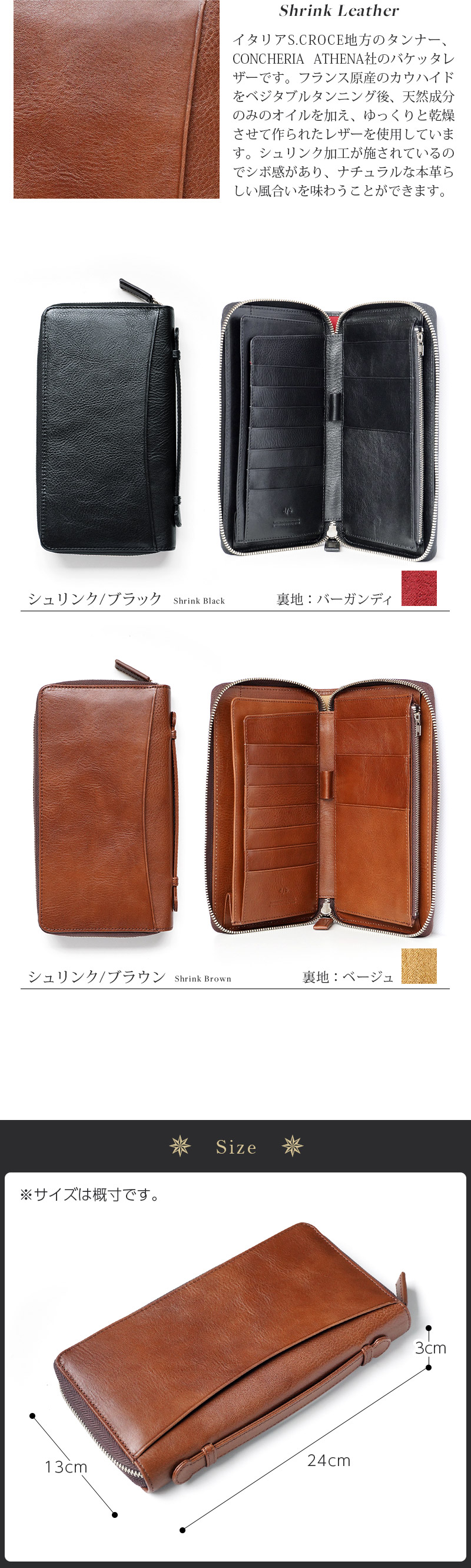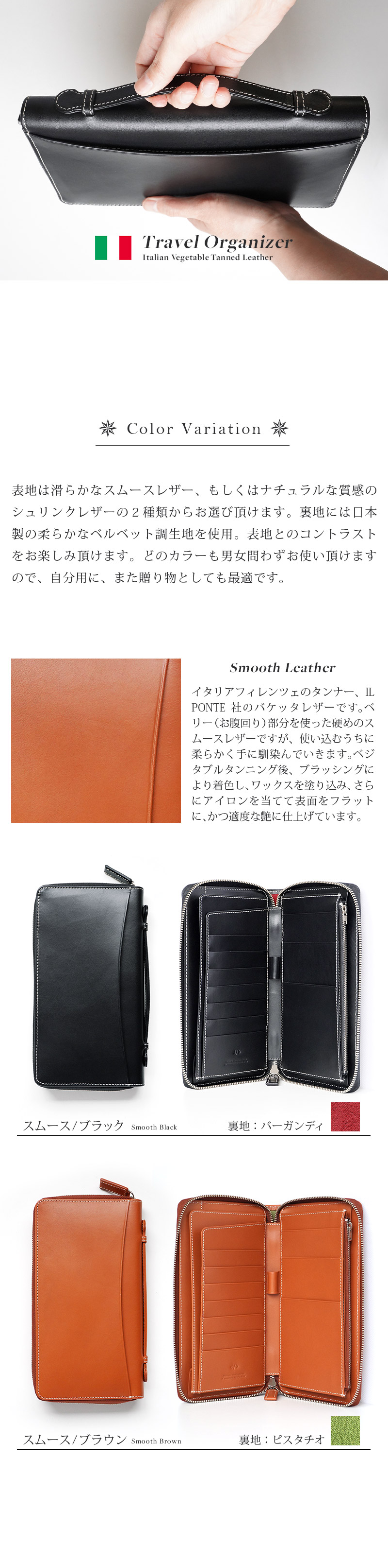 ■表地は滑らかなスムースレザー、もしくはナチュラルな質感のシュリンクレザーの2種類からお選び頂けます。裏地には日本製の柔らかなベルベット調生地を使用。表地とのコントラストをお楽しみ頂けます。どのカラーも男女問わずお使い頂けますので、自分用に、また贈り物としても最適です。