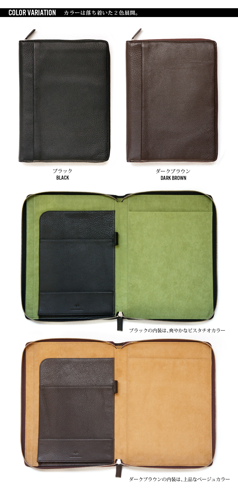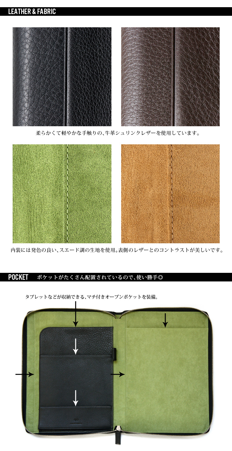 ■ムース革(鹿革)のように肉厚がありながら、とても柔らかな風合いと軽さを兼ね備えた、牛革を使ったノートパッドホルダーです。iPad AirやA4サイズの書類、ペン、電卓など、身の回りの小物をスマートに、かつスタイリッシュに持ち運ぶことができます。このノートパッドに使われている牛革は型押しではなく、天然のシュリンク(ちぢみ皺)なので、裁断する部位によってそれぞれ表情が違うのが特徴です。その手触りは、ずばりSOFT & LIGHT。一度手にすると、その柔らかさに驚くこと間違いありません。滑らかな手触りと発色の良いスエード調のポリエステル生地を内装に配色して、おしゃれに仕上げました。