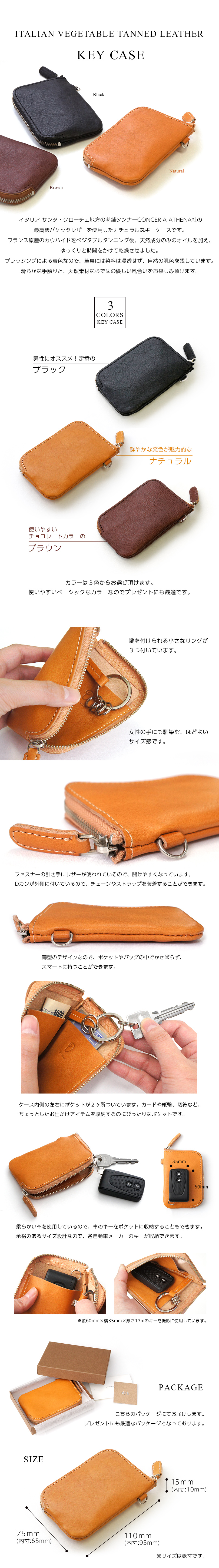 商品特長■イタリア サンタ・クローチェ地方の老舗タンナーCONCERIA ATHENA社の最高級バケッタレザーを使用したナチュラルなキーケースです。フランス原産のカウハイドをベジタブルタンニング後、天然成分のみのオイルを加え、ゆっくりと時間をかけて乾燥させました。ブラッシングによる着色なので、革裏には染料は浸透せず、自然の肌色を残しています。滑らかな手触りと、天然素材ならではの優しい風合いをお楽しみ頂けます。