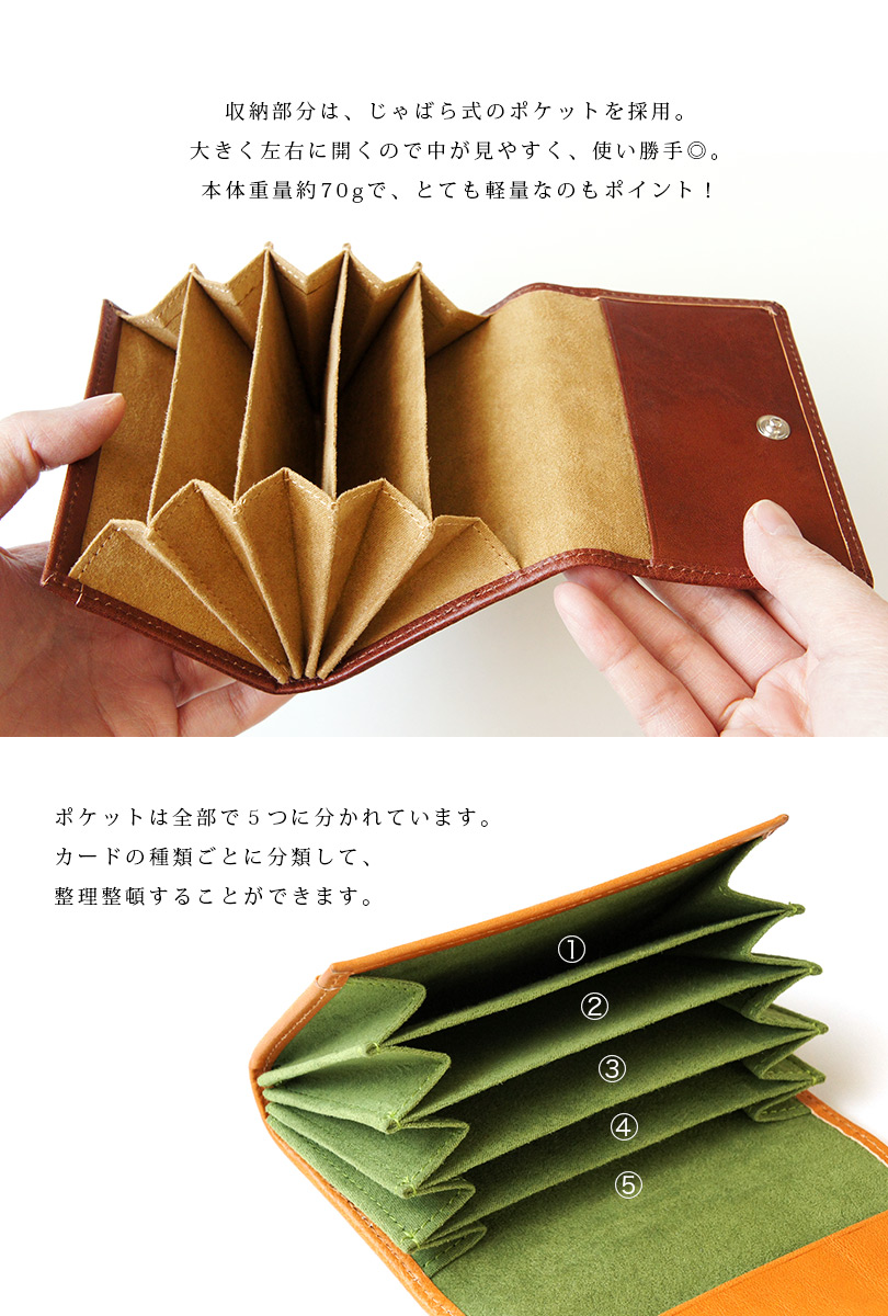 ■収納部分は、じゃばら式のポケットを採用。大きく左右に開くので中が見やすく、使い勝手◎。本体重量約70gで、とても軽量なのもポイント!