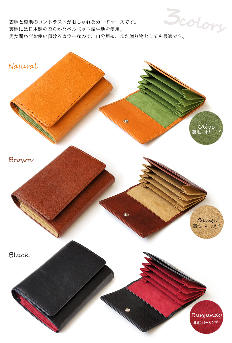 ■表地と裏地のコントラストがおしゃれなカードケースです。裏地には日本製の柔らかなベルベット調生地を使用。男女問わずお使い頂けるカラーなので、自分用に、また贈り物としても最適です。