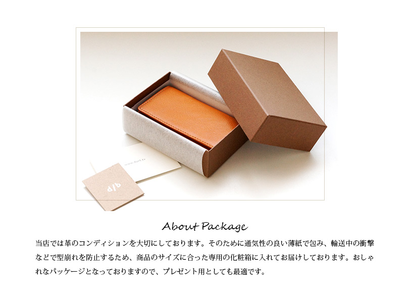 ■当店では革のコンディションを大切にしております。そのために通気性の良い薄紙で包み、輸送中の衝撃などで型崩れを防止するため、商品のサイズに合った専用の化粧箱に入れてお届けしております。おしゃれなパッケージとなっておりますので、プレゼント用としても最適です。