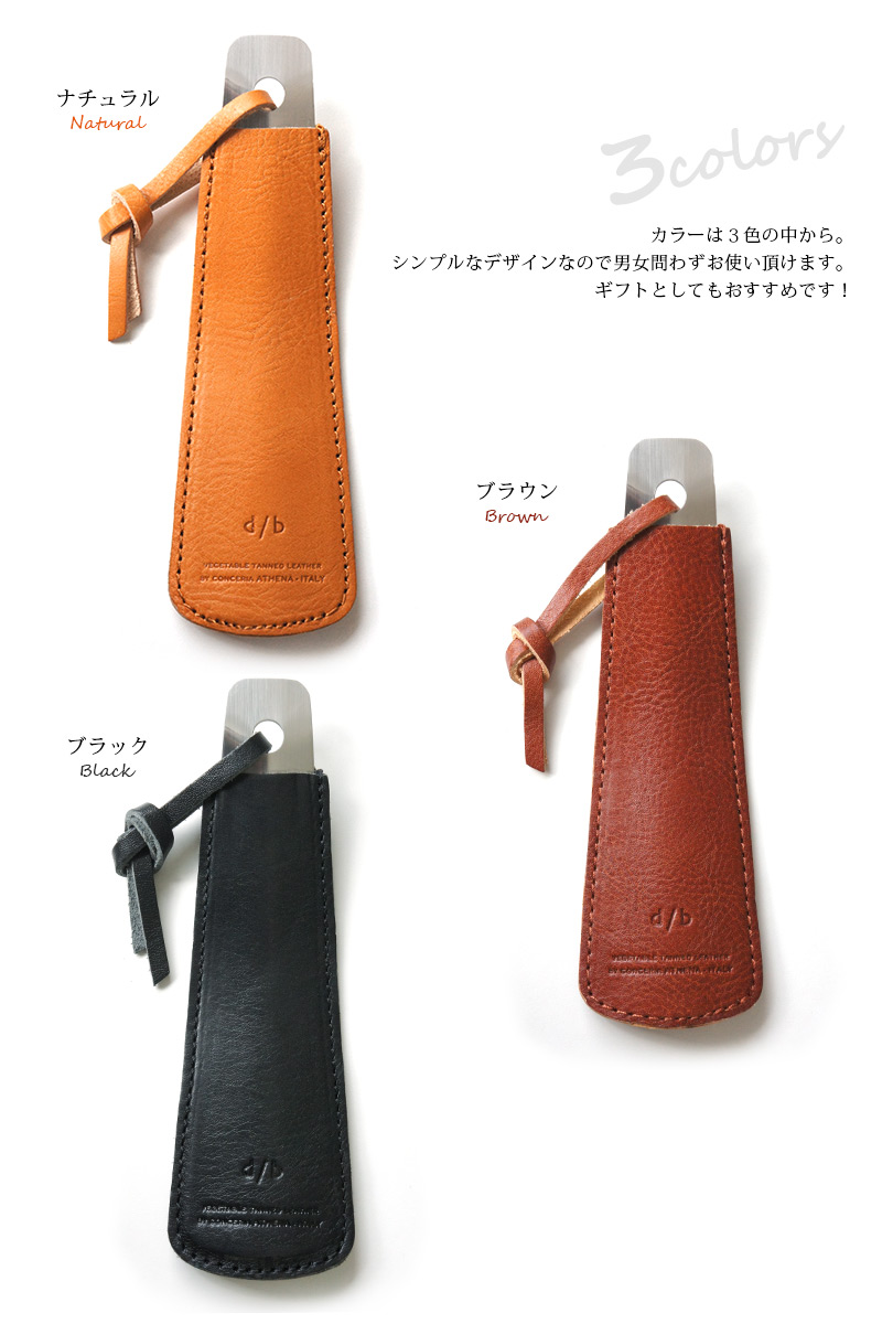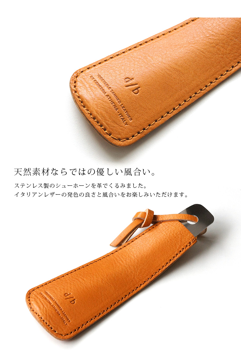 ステンレス製のシューホーンを革でくるみました。イタリアンレザーの発色の良さと風合いをお楽しみいただけます。