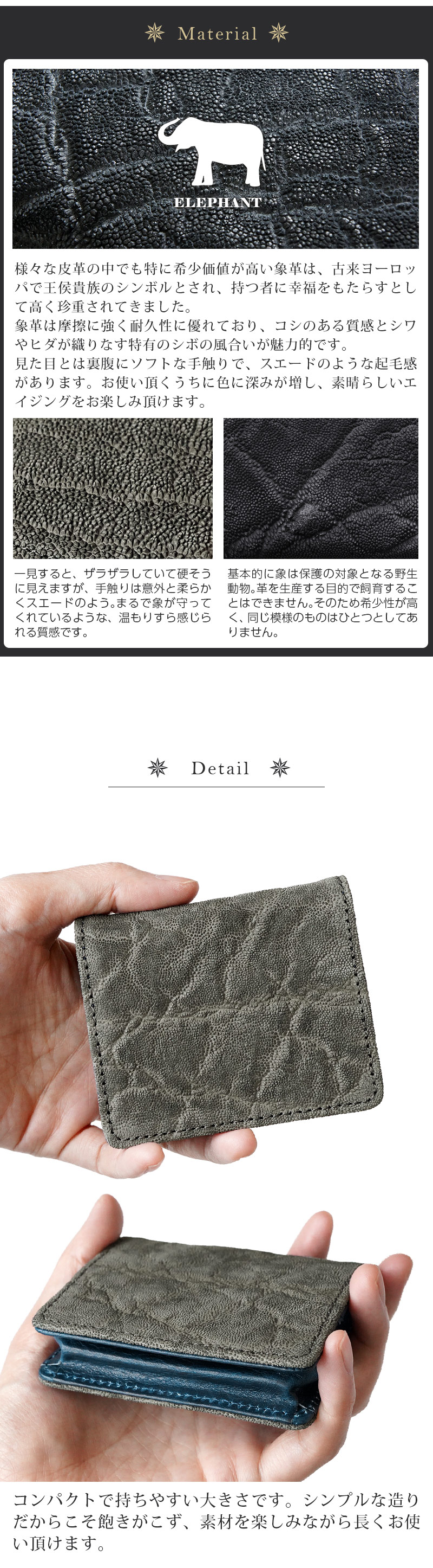 ■様々な皮革の中でも特に希少価値が高い象革は、古来ヨーロッパで王侯貴族のシンボルとされ、持つ者に幸福をもたらすとして高く珍重されてきました。