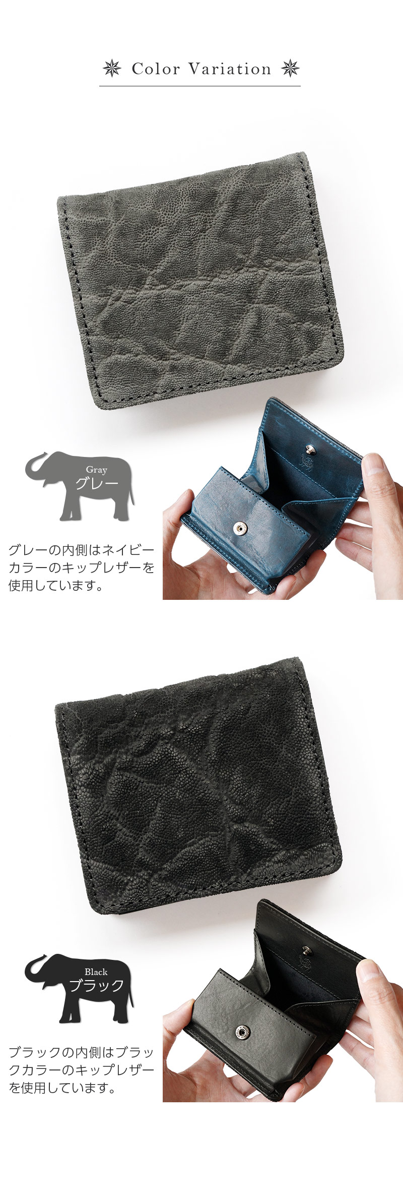象革は摩擦に強く耐久性に優れており、コシのある質感とシワやヒダが織りなす特有のシボの風合いが魅力的です。
