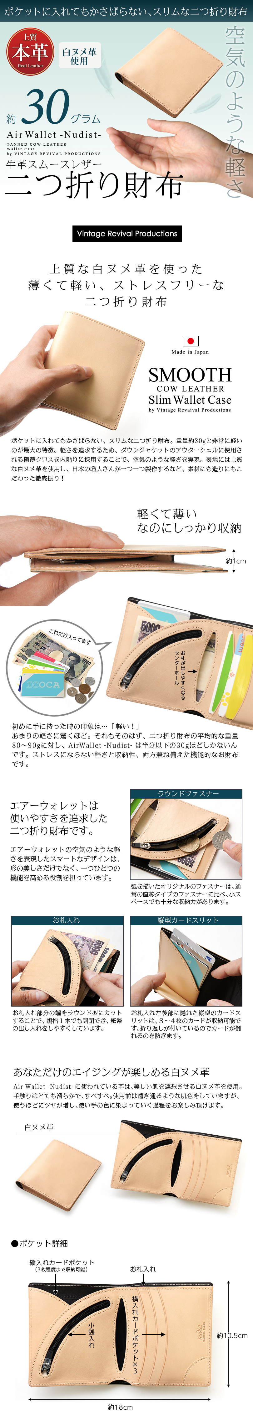 【牛革 白ヌメ革】 二つ折り財布 Air Wallet Nudist Vintage Revival Productions 本革 日本製