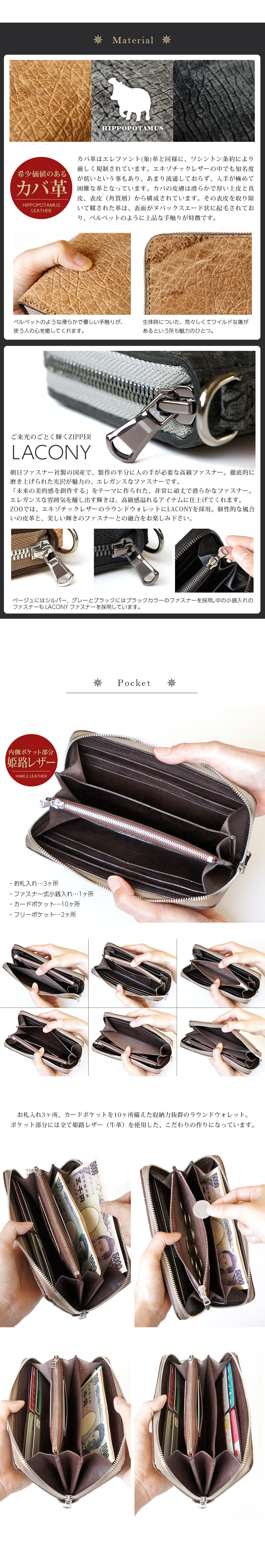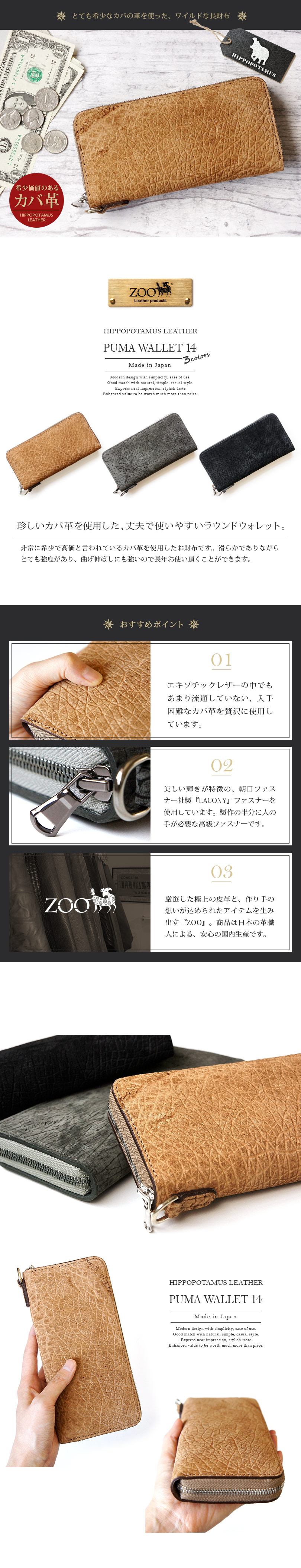 『ZOO PUMA WALLET14』 財布 本革 カバ革 姫路レザー ラウンド ファスナー カード