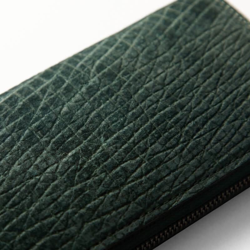 表面には網目状のシワがランダムに入っており、部位によってシワの深さや風合いが異なる為、濃淡のある味わい深い魅力があります。 カバはどう猛なため、生前時に付いたとされる深い傷跡がいたるところに見られるため、一つとして同じ表情の物がない皮革素材です。 継ぎ目がなく、このようなカバ革のシワや傷跡をリアルに感じていただけるところも、この長財布の大きな魅力です。