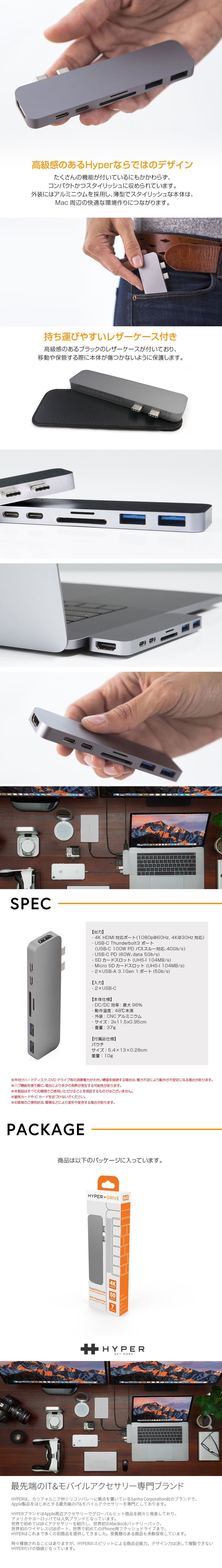 沢山の機能が付いているにも関わらず、コンパクトかつスタイリッシュに収められています。そのデザイン力はHyperブランドの特長でもあります。アルミ素材を採用したより薄型でスタイリッシュな本体は、MacBook Proのスペースグレイにマッチするカラーリングで、一体感が高まるようデザインされました。