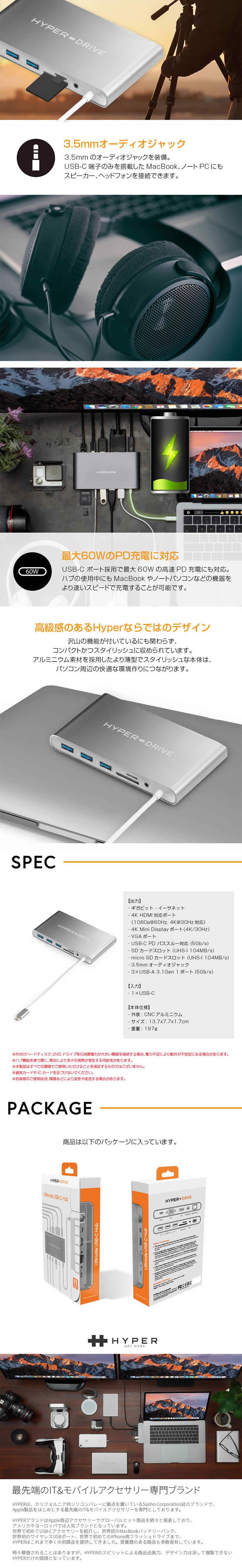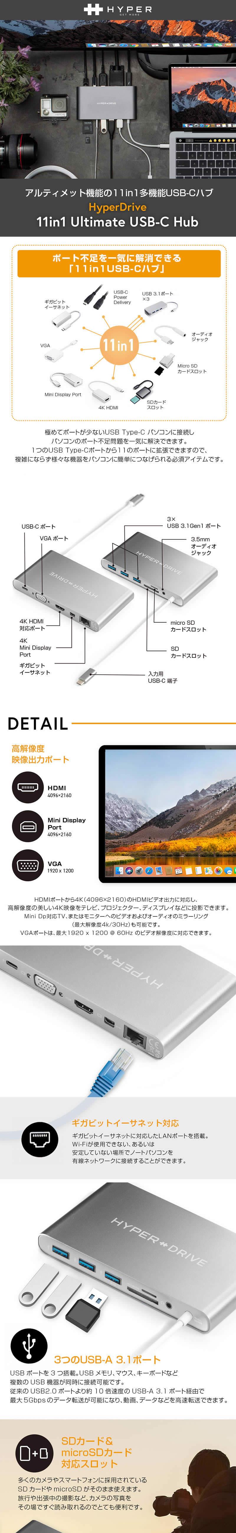商品特長 ■ HyperDrive 11in1 Ultimate USB-C Hub(ハイパードライブ11in1 アルティメットUSB-Cハブ)は、USB Type-C パソコンに一括して多様な機器を接続できる、スリムタイプにまとめたウルトラ機能の「11in1USB-Cハブ」です。