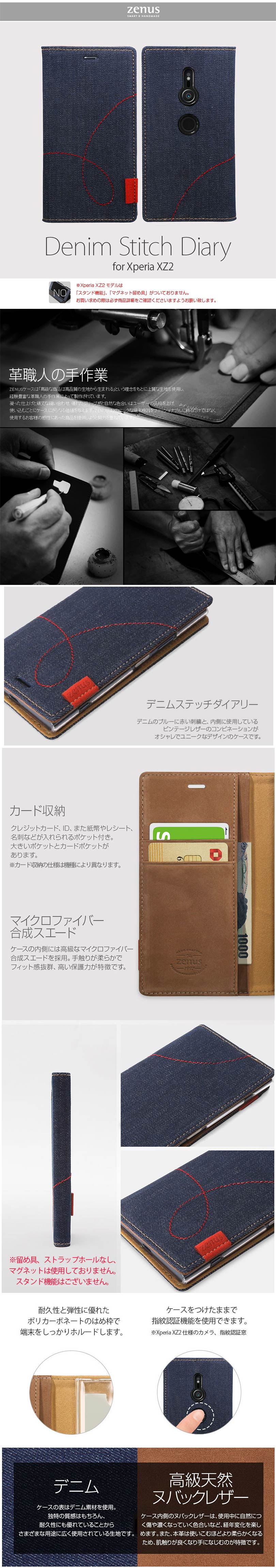 『 ZENUS Denim Stitch Diary 』 Xperia XZ2 ケース 手帳 おすすめ デニム 本革