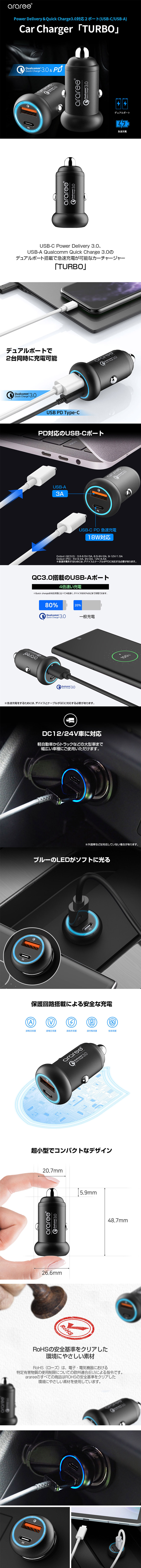 商品特長 ■araree(アラリー)の「Power Delivery&Quick Charge3.0対応2ポート(USB-C/USB-A) カーチャージャー TURBO 」はUSB-C Power Delivery 3.0、USB-A Qualcomm Quick Charge 3.0のデュアルポート搭載で急速充電が可能なカーチャージャーです。