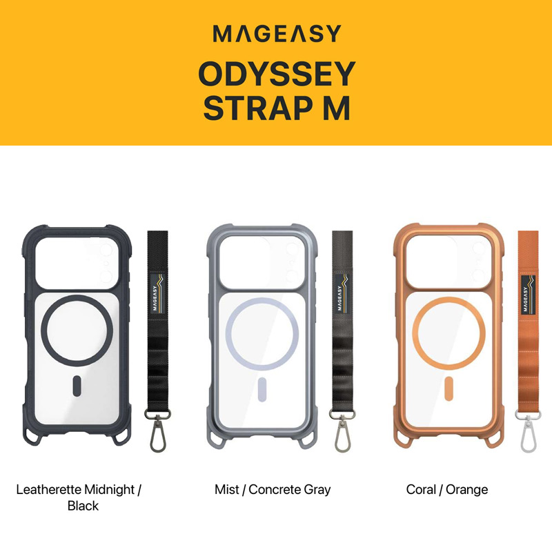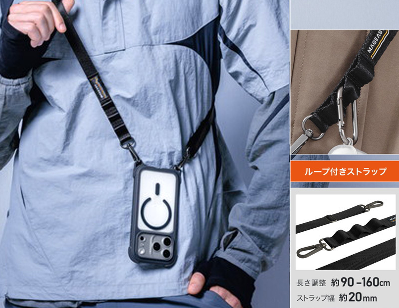 長さ調節可能なストラップには、カラビナやキーリングなどを装着できるループが付いています。
