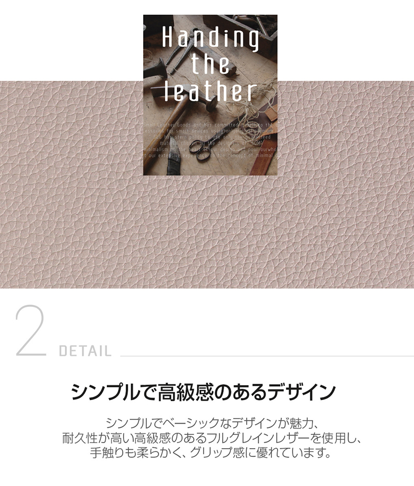 耐久性が高い高級感のあるフルグレインレザーを使用しています。牛革にキメ細かいシボ加工(シワ模様)を型押しを施した上品で高級感のあるケースです。手触りも柔らかく、グリップ感に優れています。