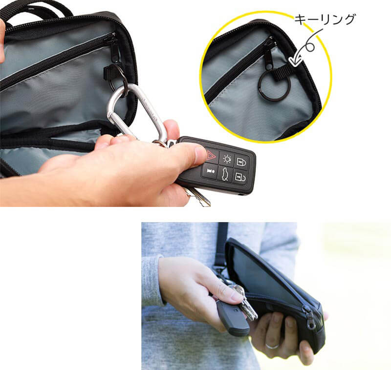 スマートキーもぶら下げることができる、便利なキーリング付き。ここに下げておけば、鍵類がカバンの中で迷子になることもありません。鍵をカラビナなどでまとめている場合は、このリングに直接装着して使うこともできます。ちょっとした事ですが、ついているだけで凄く便利なパーツです。