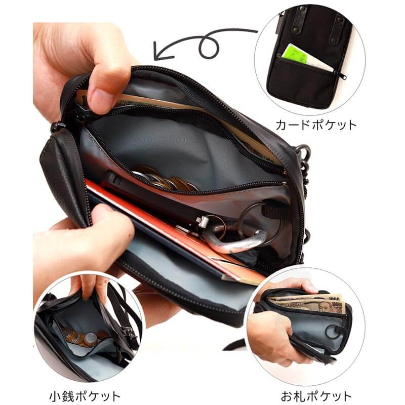 ※それぞれの素材は撥水・止水の効力がありますが、完全防水ではございません。 ※撥水加工の効能は永久ではありません。表面加工なので徐々に落ちていきます。 ※水に濡れた場合、放置せずハンカチなどで拭き取るようにしてください。 ※縫い目・内生地・ショルダーベルトには撥水加工は施しておりません。